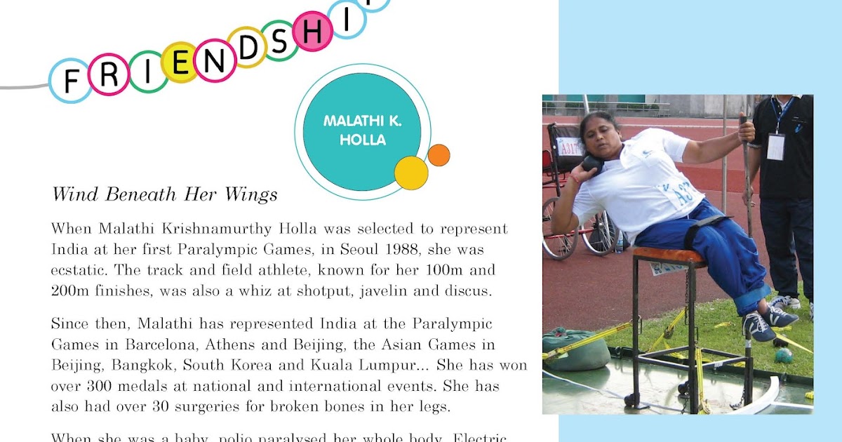 Malathi Holla - She represented india in the paralympics held in south korea, barcelona, athens and beijing. Malathi Holla - She was born on july 6, 1958 in bangalore.