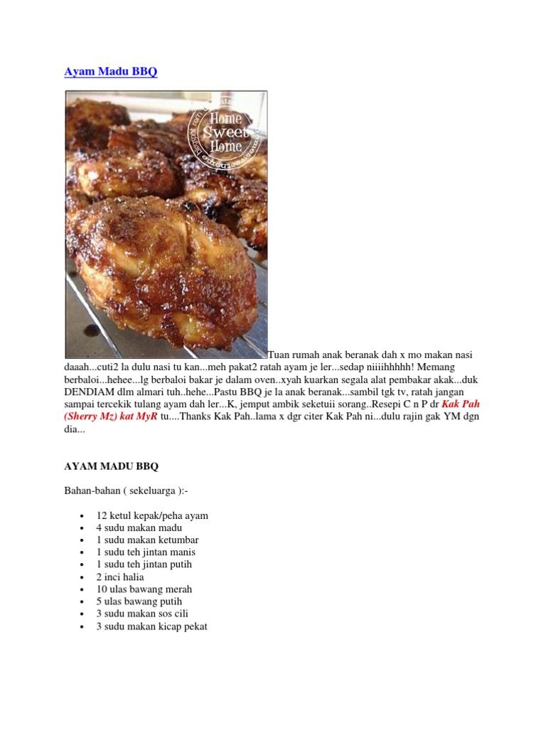 Resepi Ayam Madu Merah Bbq : Kumpulan resepi ayam masak merah/ dengan mudah dan rasa nya sedap , dengan aneka rasa , baik pedas atau yang lainnya , dengan berbagai ala dan masih banyak resepi ayam masak merah lainnya, jika kalian tu reques resepinya , silakan di tulis di comment.
